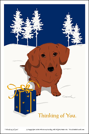 "Thinking of You" is the eighth release in a continuing series of holiday dachshund postcards by Adrianne C.